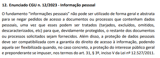 - Este enunciado é possivelmente o mais importante, pois dificulta o chamado "sigilo dos 100 anos": mesmo que haja informações pessoais em um documento, os órgãos deverão tarjar a informação e dar acesso ao restante.