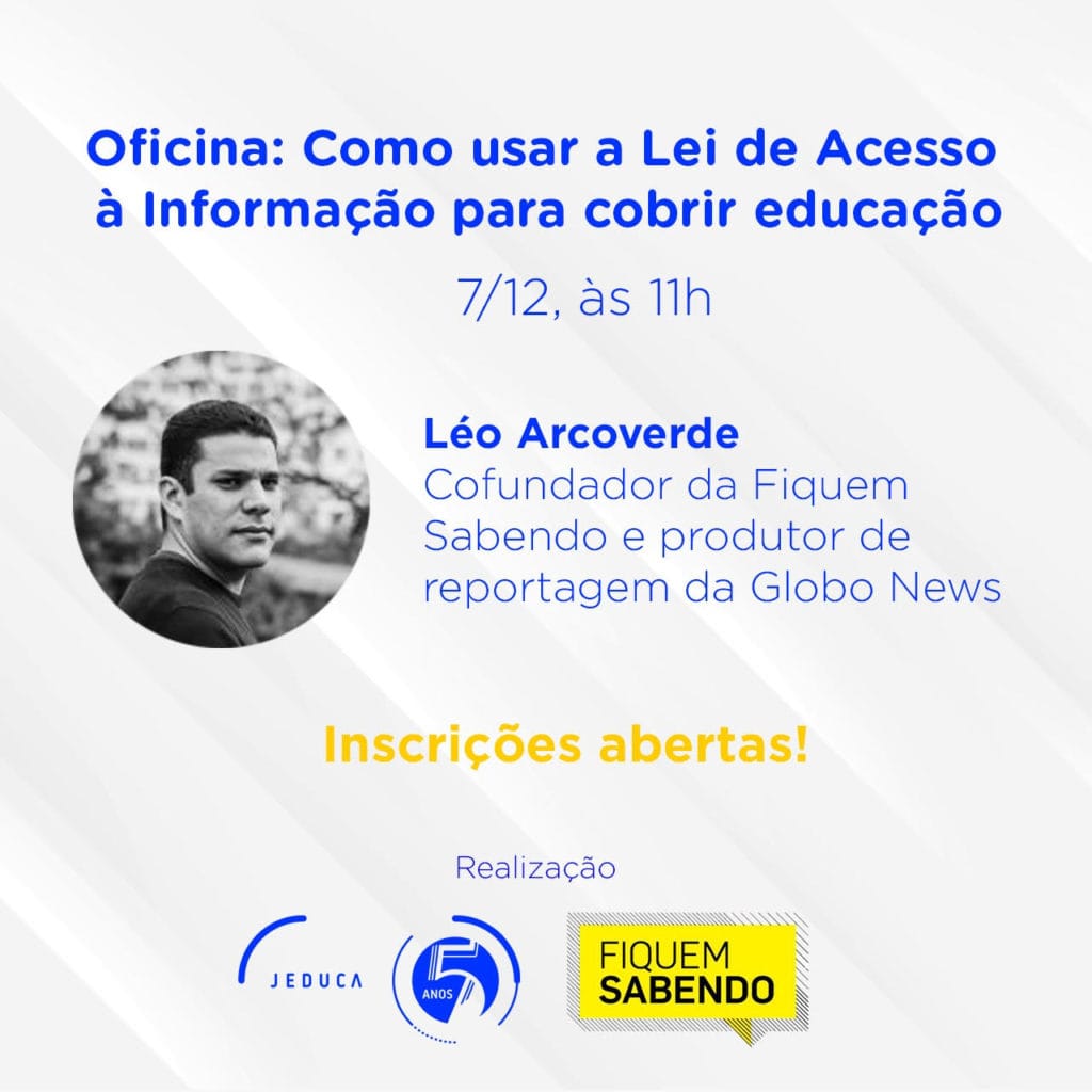 Em parceria com a Jeduca, Associação de Jornalistas de Educação, a Fiquem Sabendo, agência de dados independente e especializada no acesso a dados públicos, realiza a oficina “Como usar a Lei de Acesso à Informação para cobrir educação”. Será no dia 7 de dezembro, às 11 horas. A oficina é gratuita e exclusiva para jornalistas, profissionais da imprensa e estudantes de jornalismo. As inscrições podem ser feitas aqui até o dia 6 de dezembro.