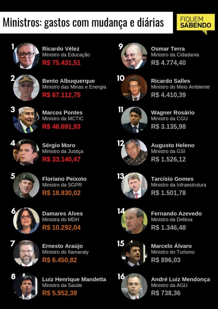 Em comparação, o quinto colocado gastou R$ 319,15 reais por dia e o 16º, apenas R$12,51. Veja os gastos de todos os ministros aqui!