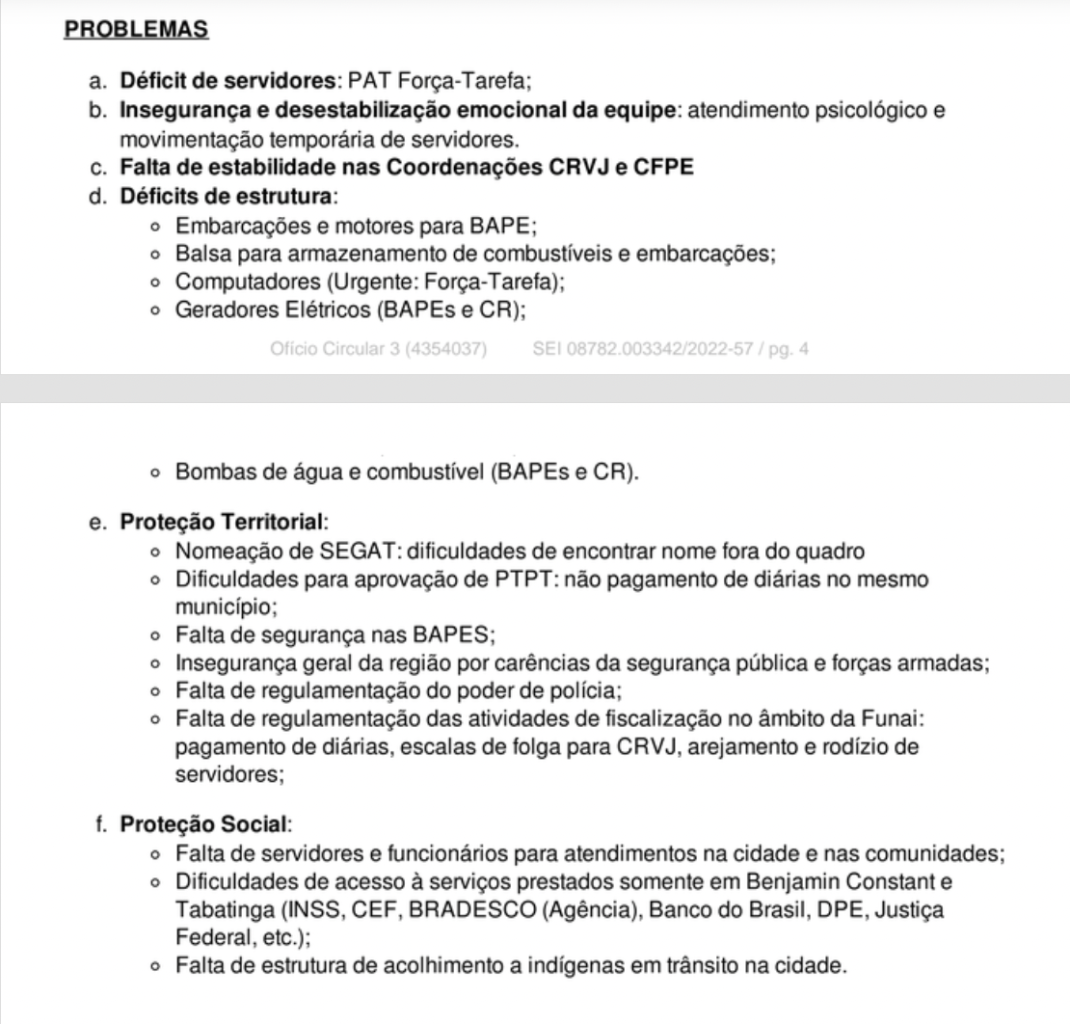 Os cortes acontecem em um momento em que servidores da fundação têm apontado a necessidade de mais recursos. Um ofício da Coordenadoria Regional do Vale do Javari de 29 de julho, obtido por nossa equipe, apontou como problemas da região o déficit de servidores e de estrutura. Os funcionários pediam compra de embarcações e motores, balsa para armazenamento de combustíveis e embarcações, computadores e geradores elétricos, dentre outros.