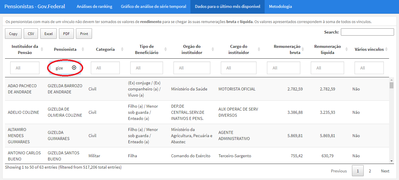 3. Na coluna “Pensionista”, digite o nome que você procura na caixa escrito “All” em cinza. Basta aguardar um pouco que, logo em seguida, aparecerão na tabela os resultados correspondentes ao nome que você procurou.