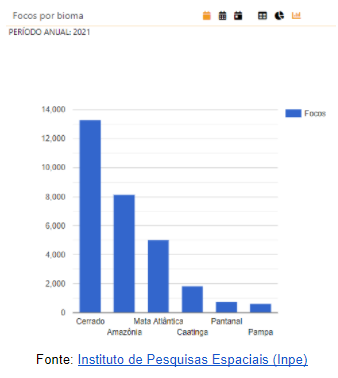 De acordo com o Instituto Nacional de Pesquisas Espaciais (Inpe), a Amazônia, o Cerrado e o Pantanal são os biomas mais atingidos pelo fogo. Na Amazônia, por exemplo, os focos de calor aumentaram 2,6% no mês de junho, em relação ao mesmo período de 2020. Na contramão do agravamento das queimadas florestais, o investimento do governo federal diminuiu. Em 2020, o Ibama chegou a suspender as atividades dos brigadistas em outubro, ainda na ação de controle e combate das queimadas, por falta de recursos.