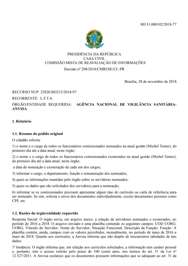 A própria Anvisa tentou negar e segurar as informações por meses, até a determinação da CMRI, algo raríssimo. Segundo os dados do governo federal, de 328 recursos analisados pela comissão em 2018, só 4 foram deferidos (1,22%).