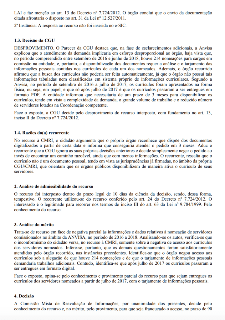 - O precedente da CMRI que indicamos acima, dizendo que a instância máxima da LAI já entendeu possível o acesso a currículos. Basta copiar o link ou o número da decisão.