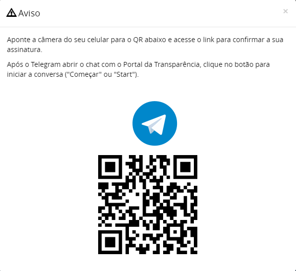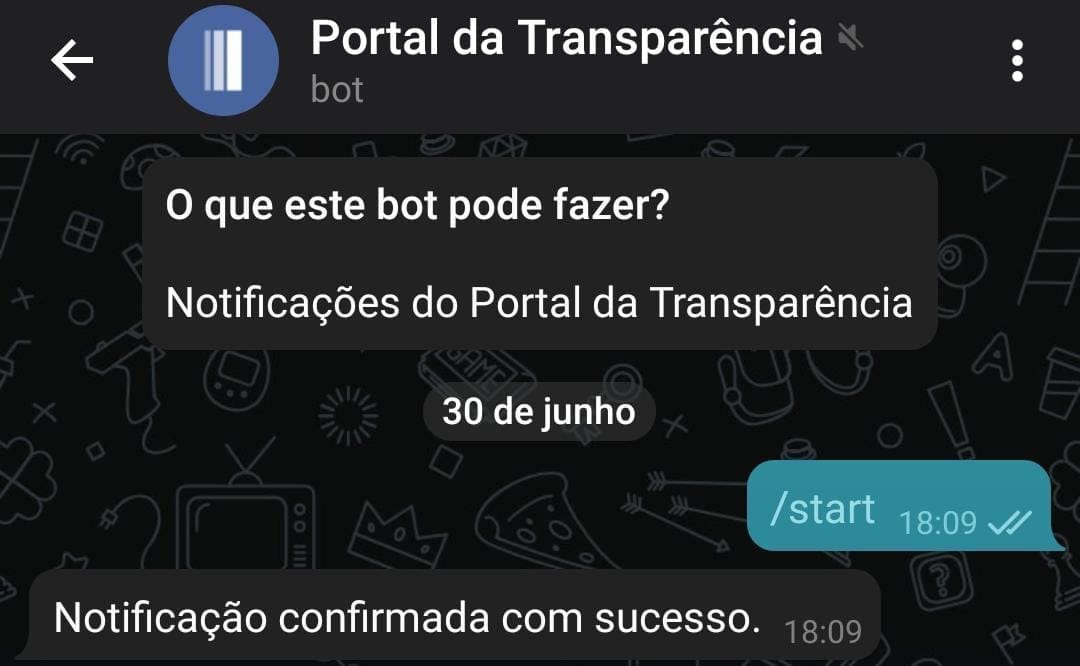 5. O link irá te redirecionar para o bot (robô) do Portal da Transparência no Telegram. Você clica em “Começar” e pronto, seu cadastro está feito!