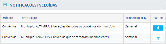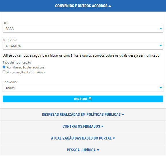 2. Selecione as notificações que deseja receber a partir dos módulos que aparecem em seguida: convênios e outros acordos; despesas realizadas em políticas públicas; contratos firmados; atualizações das bases do Portal da Transparência; e pessoa jurídica. Não esqueça de clicar em “Incluir” para que suas escolhas sejam salvas.