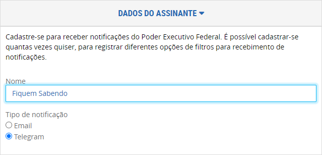 1. Acesse o site portaltransparencia.gov.br/notificacoes, vá em “Dados do assinante”, digite seu nome e selecione o Telegram em “Tipo de notificação”.