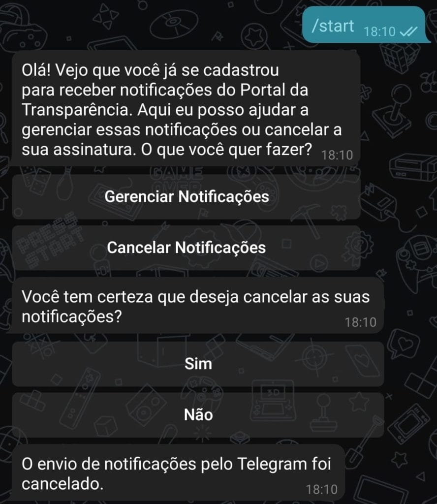 Caso você queira gerenciar ou cancelar as notificações, você deve clicar em “Começar” novamente. Se a opção não estiver disponível, basta digitar “/start” e enviar. Você ainda pode clicar no link da opção “Já sou cadastrado” no link: portaltransparencia.gov.br/notificacoes.