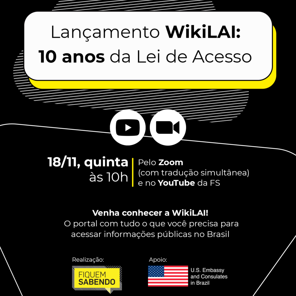 Nos 10 anos da publicação da Lei de Acesso à Informação (LAI), a Fiquem Sabendo, agência especializada no acesso a dados públicos, lança a WikiLAI, um portal único com tutoriais e explicações para acessar informações públicas no Brasil. O projeto será apresentado ao público em live com especialistas brasileiros e americanos no dia 18/11, quinta-feira, às 10h, pelo Zoom (com tradução simultânea) e pelo YouTube da FS (com áudio original). Para acompanhar o evento pelo Zoom é necessário se inscrever gratuitamente no link bit.ly/livewikilai.