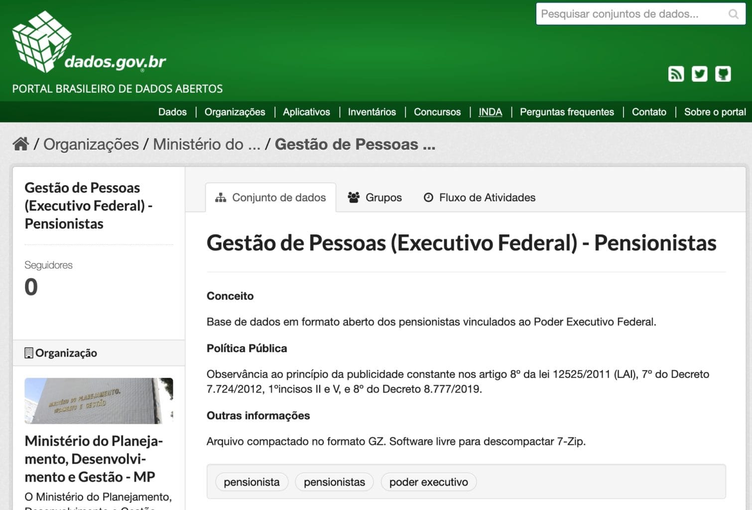 03/12/2019 - ME publica, sem alarde, a base intitulada "Gestão de Pessoas (Executivo Federal) - Pensionistas", no Portal Brasileiro de Dados Abertos, com a descrição "Base de dados em formato aberto dos pensionistas vinculados ao Poder Executivo Federal", como sendo este o documento oficial que representa os pagamentos do governo federal a pensionistas nos meses de novembro e dezembro, sem indicação de lacunas.