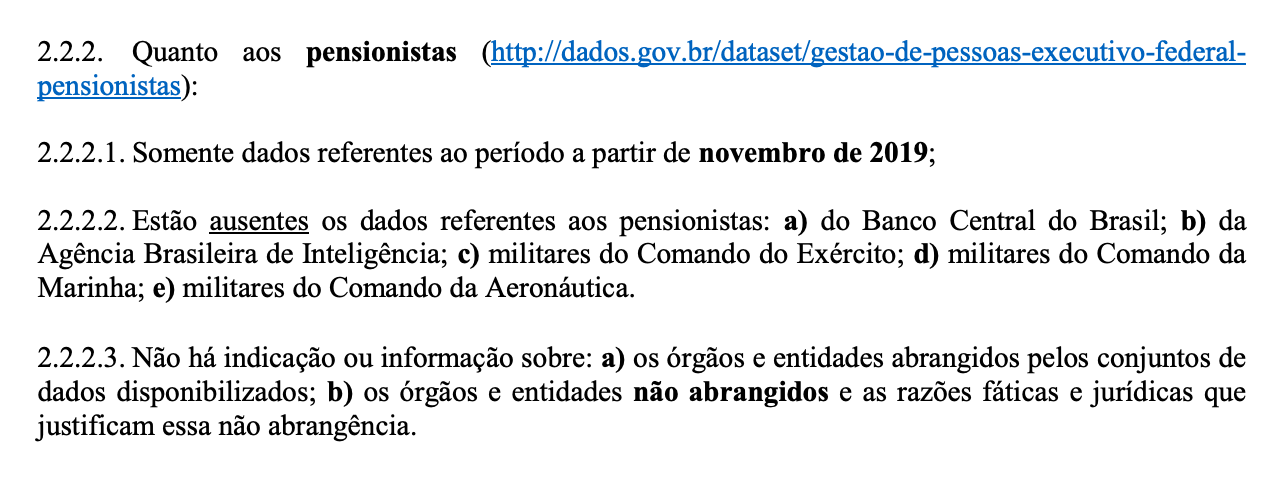 O Ministério da Economia disponibiliza informações dos servidores instituidores de pensão e pensionistas do Poder Executivo Federal, não incluindo dados sobre poderes Judiciário e Legislativo. Conforme normatizado, não estão incluídos também dados relativos aos servidores do Banco Central do Brasil, Abin, Militares, Governo do Distrito Federal (Fundo Constitucional) e demais entes federados, responsáveis pela publicação dos seus dados em portais próprios.