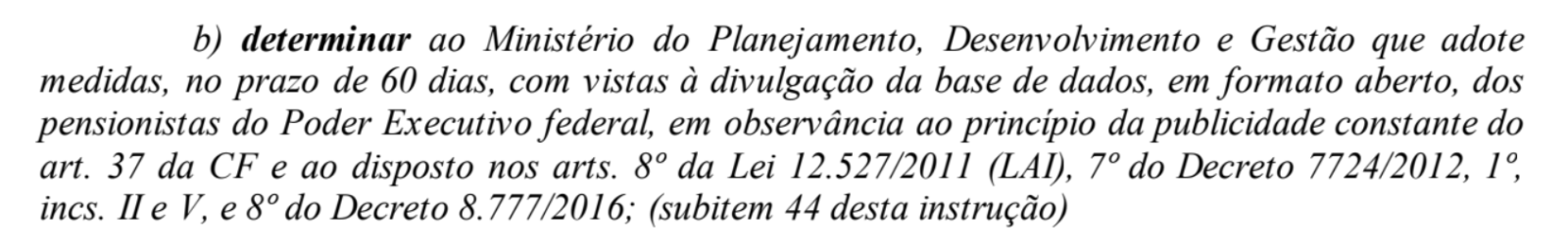 A ordem para publicar a íntegra dos pagamentos a beneficiários de pensão do Poder Executivo Federal partiu do Tribunal de Contas da União (TCU) no acórdão 2154/2019, que acatou em setembro do ano passado a denúncia do Fiquem Sabendo - protocolada ainda em 2017.