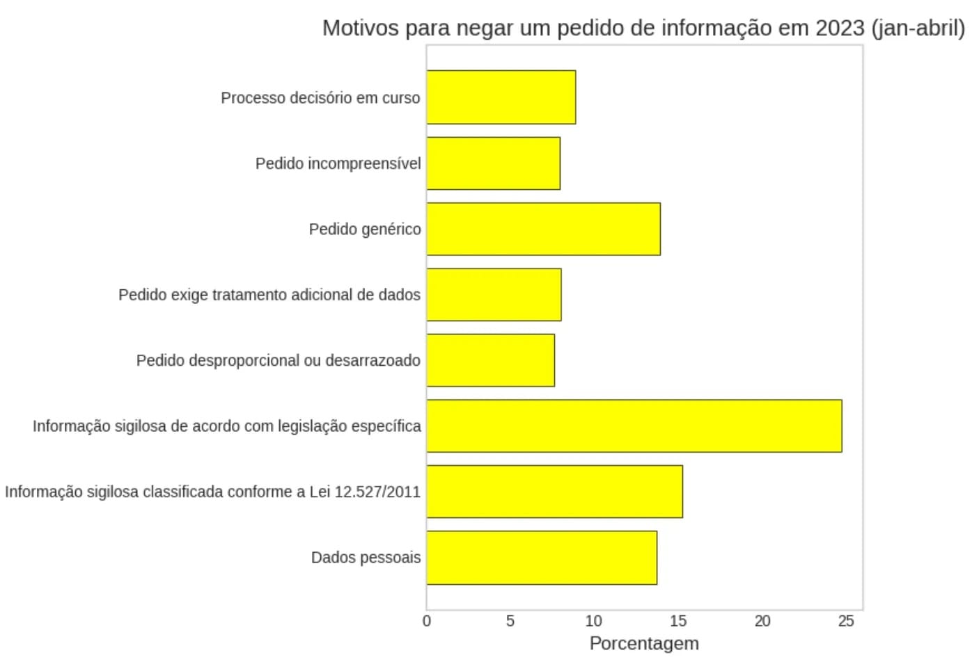 Há oito categorias para pedidos negados: dados pessoais, informação classificada pela LAI, informação sigilosa segundo outras leis, pedido desproporcional, pedido exige tratamento adicional de dados, pedido genérico, pedido incompreensível e processo decisório em curso.